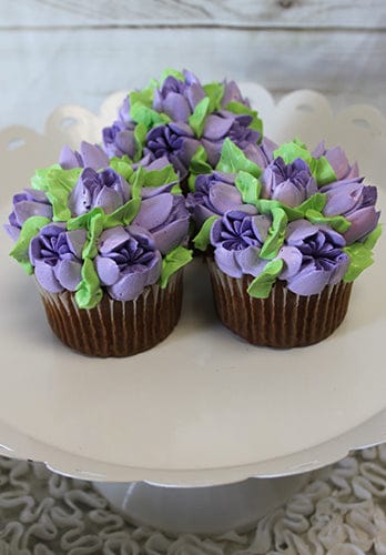 Gold cupcake with white mousse filling with lavender floral design.