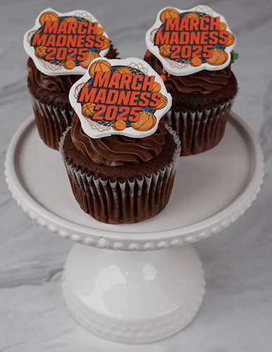 Chocolate buttercream frosting with March Madness logo and confetti.