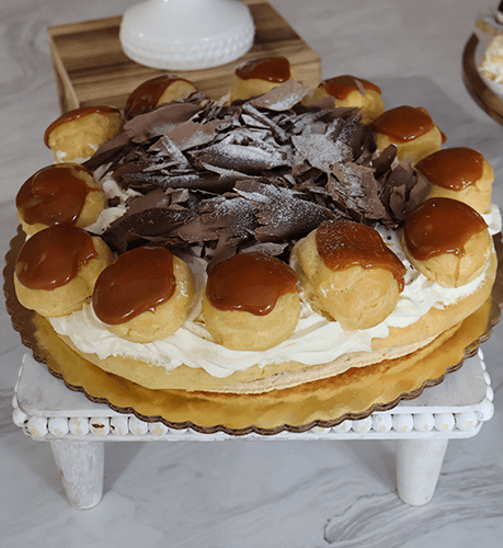 Gateau St. Honore Pate a choux tart filled with pastry cream. Choux puffs filled with pastry cream and dipped in caramel. Chocolate shavings in center.