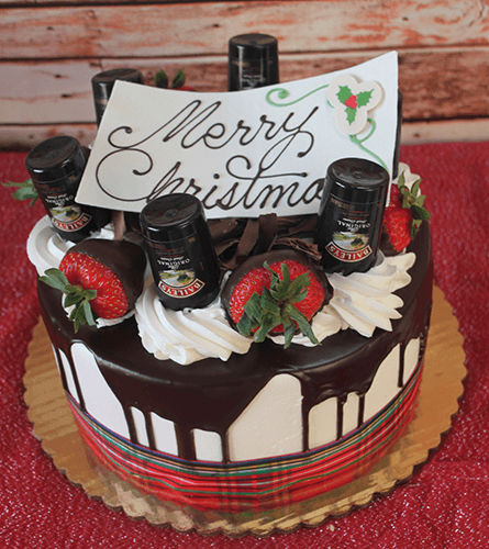 Gold cake with chocolate baileys mousse filling. White buttercream frosting with ganache drip. Chocolate dipped strawberries alternating Bailey’s nips. Nips provided by our distributor Wollaston Liquors. Must be 21 to order and I.D. upon pick up.
