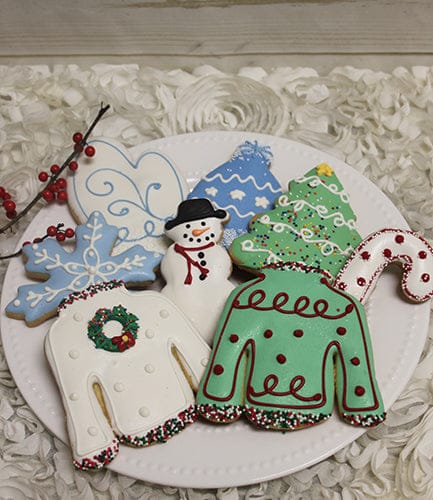 Assorted sugar cookies dipped in chocolate embellished with holiday decor.