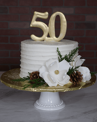 Extra high cake with white buttercream horizontal texture. White magnolias with gold accents and fresh greens and pinecones. Standing gold number.