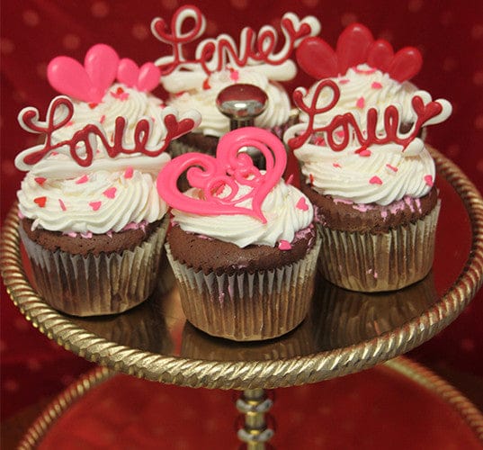 Chocolate cupcakes with white mousse filling. White buttercream frosting with valentine decor.