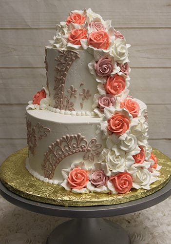 Petite wedding or any occasion cake serving 25-30 people. White buttercream frosting with champagne pink fancy scroll on side. Cascade of coral, white and champagne pink buttercream roses with white leaves.